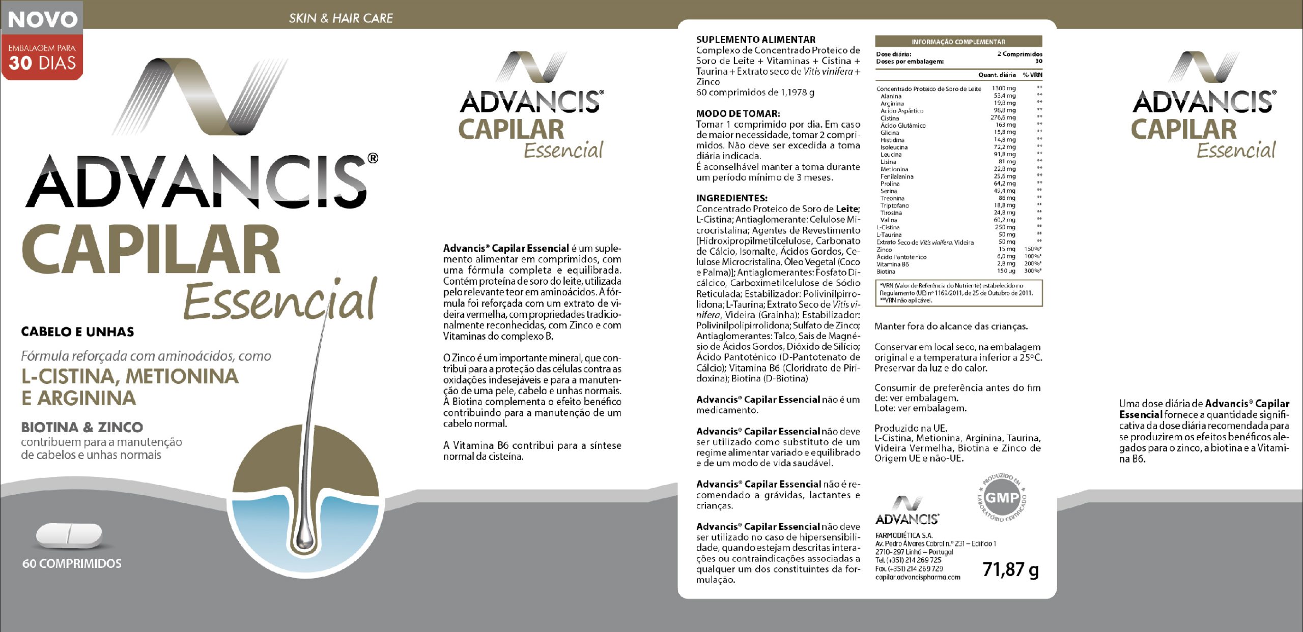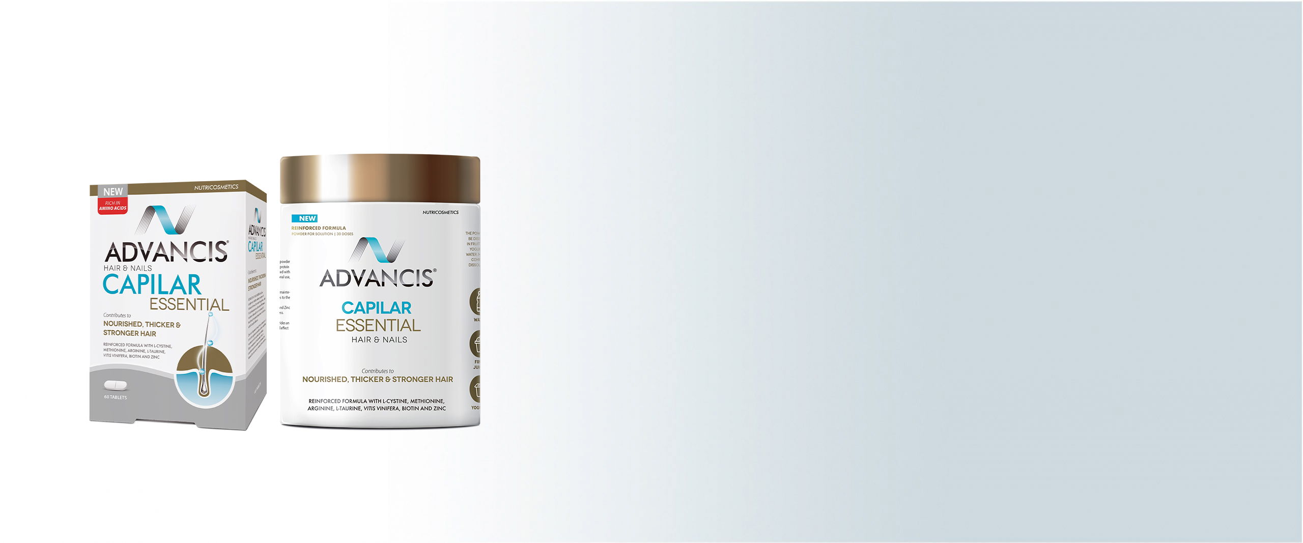 Advancis® Capilar Essential is a food supplement. It should not be used as a substitute for a varied and balanced diet and a healthy lifestyle. A daily dose of Advancis® Capilar Essential provides the necessary amount to produce the beneficial effects claimed for Zinc, Biotin and Vitamin B6.