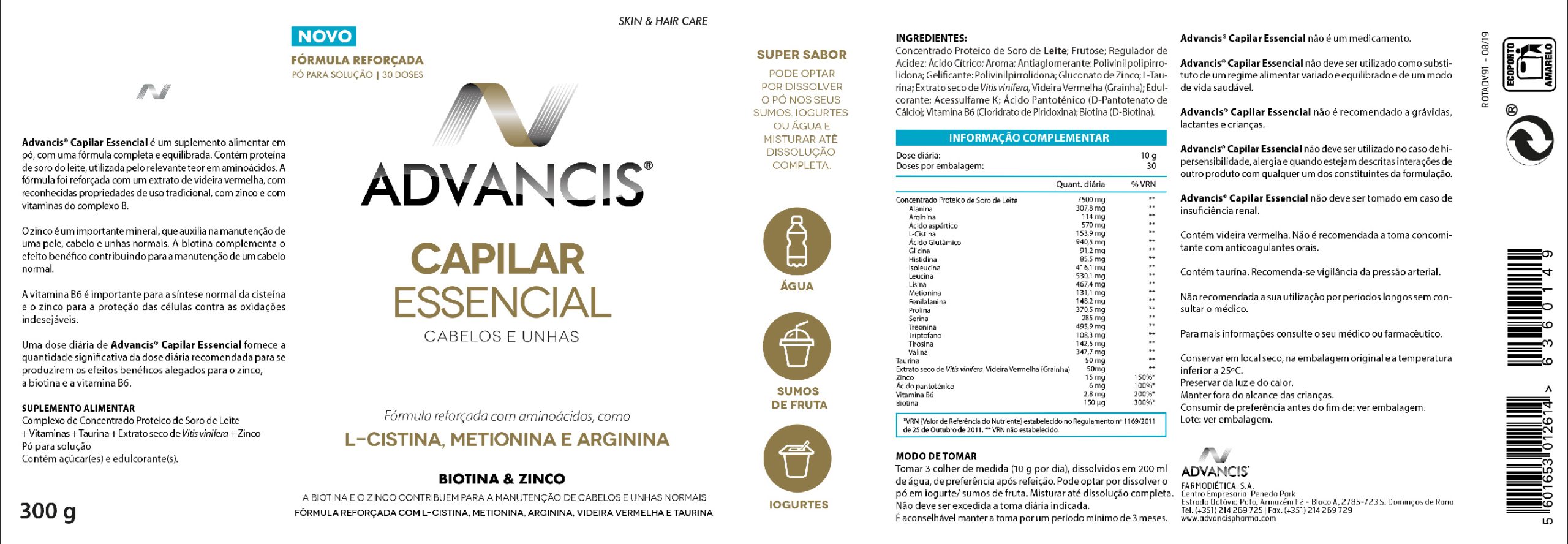 Advancis® Capilar Essential in Powder: Take 10g per day, dissolved in 200 ml of water, preferably after a meal. You can choose to dissolve the powder in yogurt/fruit juice.